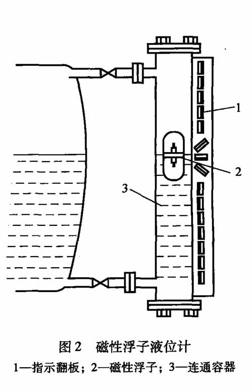 硝酸銨溶液生產(chǎn)企業(yè)里多數(shù)使用磁性浮子防爆型磁翻板液位計,防爆型磁翻板液位計根據(jù)浮力原理和磁性耦合作用研制而成,如圖2所示。