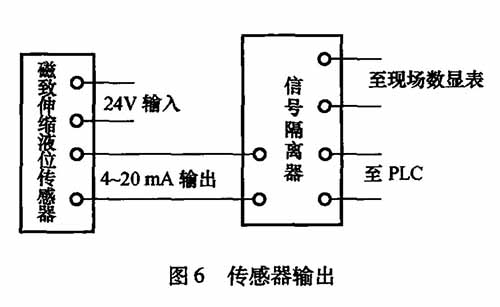 MTS的磁致伸縮式液位儀為法蘭安裝,貯罐罐頂已留有預(yù)留孔。安裝時,調(diào)試過程簡單,只需通過調(diào)試測量頭上的智能型儀表,標(biāo)定上、下限液位數(shù)據(jù)后即可。輸出的標(biāo)準(zhǔn)信號4 ~ 20mA通過隔離光柵直接與PLC的模數(shù)轉(zhuǎn)換模塊相連。