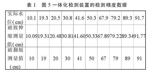 我們把圖5所示的一體化檢測裝置進(jìn)行了水位檢測實驗,其檢測結(jié)果與實際水位值見表