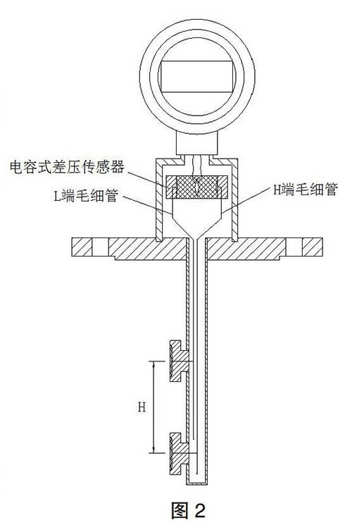 我們設(shè)想用差壓原理,將差壓高壓端(H端)做出充油的毛細管和受壓膜盒,毛細管加膜盒長度為從帶壓容器上的連接器到容器底部;差壓變送器低壓端(L端)也做一個膜盒,膜片直徑同高壓端的膜盒。這個膜盒置于上端的容器內(nèi),連接器下,也可以置于連接上邊的封閉腔室內(nèi),封閉腔室與連接器(法蘭)上有差壓傳感器低壓端引壓孔,與被測容器相連。用以自動減去容器內(nèi)壓力。為了使差壓變送器高低端由于真空下充灌硅油等導(dǎo)壓介質(zhì)對差壓造成的誤差盡可以少,將低壓端的毛細管做成與高壓端等長,毛細管下端封閉。這樣,雙向毛細管所產(chǎn)生的壓力幾乎相等,產(chǎn)生差壓幾乎為零。這樣設(shè)計還有另外一個重要功能,就是,無論充填什么樣的導(dǎo)壓介質(zhì),都要產(chǎn)生膨脹與收縮,只要有溫度變化,這種變化就有,由于雙向等長等容,兩個膜盒幾乎處于同一溫場,這種溫度變化產(chǎn)生的影響可以自動抵消,由充填導(dǎo)壓介質(zhì)產(chǎn)生的誤差很小。