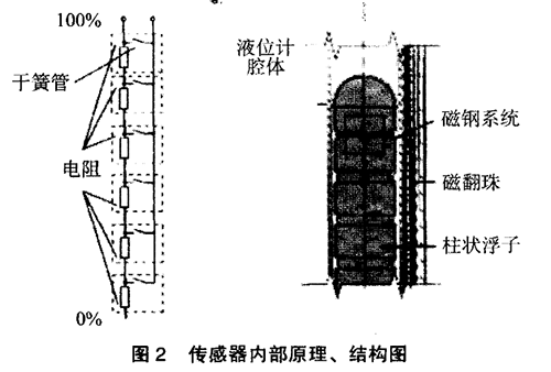 傳感器的作用是采樣液位高低位置并轉(zhuǎn)換成標準信號傳送至控制室,傳感器實際由干簧管和電阻組成。當浮子內(nèi)磁鋼位置變化后,磁場通過器壁帶動傳感器內(nèi)干簧管觸點吸合。干簧管吸合的位置決定回路的阻抗大小,干簧管的通常位置為10mm1組。回路的大小正好與液位的高低成正比,這樣*后由置于傳感器外殼內(nèi)的變送器將電阻信號轉(zhuǎn)換成標準的電流信號,送至控制室。具體結(jié)構(gòu)、原理圖見圖2。