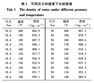 在實際過程中,加熱器中不同位置的水溫是不一致的,它和加熱器的形狀、體積等條件有關,同理在測量通道中不同位置的水溫也是不一致的。這會對理論計算造成較大的困難,在此對容器中水的溫度分布做了簡化。如圖1所示,在閥門V的左端為加熱器的水溫,假設水溫一致,且都為T1,在閥門V的右端為測量通道的水溫,設水溫一致,且都為T2。在加熱器額定工作壓力P的情形下,T1溫度和T2溫度下對應的水的密度分別為ρ1和ρ2。在閥門V處,左端的壓力等于右端的壓力,由此可得: