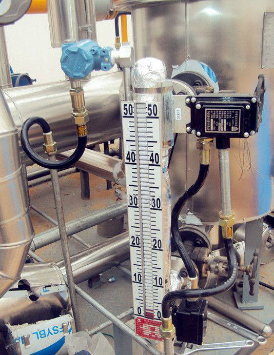 鑒于純水液位計具有被測介質與指示機構完全隔離,密封性能好,防泄漏、適應腐蝕條件下的液位測量等優點,且可靠性高、耐振性能好、結構簡單、安裝方便、維護費用低,現已在電力、石油、化工、冶金、環保、船舶、建筑、食品等行業得到廣泛應用。本公司用戶上海某公司帶熱壓縮器低溫多效蒸餾海水淡化的濃鹽水、蒸餾水及冷凝水液位測量都采用帶遠傳的純水液位計。為了防止結垢,需在低溫的情況下讓海水達到沸點,要求海水淡化裝置內部處于負壓狀態,正常運行時為-0.093MPa左右,此為用戶純水液位計使用須達到的工藝要求,以下說明即為儀表在負壓狀態下發生管路漏氣的典型故障分析情況。
