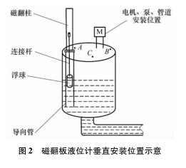 圖 2 中, B 點靠近電機和泵, 蒸餾水液位計安裝在此處既影響電機及泵的檢修, 又因泵附近液位的環(huán)流波動較大, 對浮子導(dǎo)向管沖刷嚴重, 故 B 點不合理; C 點處因有管道通過, 不便維護且影響管道和泵、 電機等的起吊更換, 故也不能選擇 C 點; A 點遠離泵和電機, 且有足夠的空間安裝翻板, 便于維護,所以 A 點較為合適。