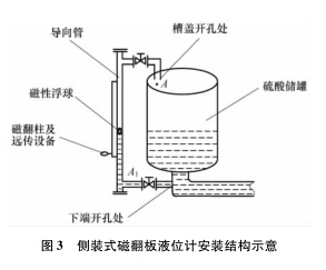 側(cè)面安裝方式的關(guān)鍵點在于: ①酸槽內(nèi)壁襯有瓷磚, 故引流管上開孔應(yīng)選擇槽蓋合適位置, 下孔*好在進口管上, 且均需加閥門, 便于維護; ②考慮管內(nèi)硫酸在*端天氣時對磁翻柱及測量裝置的影響,因本公司循環(huán)槽溫度在75 ℃左右, 為避免夏天溫度過高影響傳感器測量, 冬天防凍, 管徑 D 應(yīng)在 80mm 以上可保證正常測量。