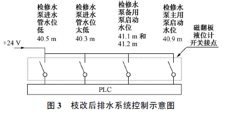 現場安裝丙酸液位計時, 裝置標尺的0 位, 對應的實地高程為EL .40 .0 m 。浮子開關設定5 個水位動作值, 檢修水位低開關量報警值對應的高程為40 .3 m ;停止所有檢修水泵的開關量, 所對應的高程為40 .5 m ;啟動主用檢修水泵的開關量, 所對應的高程為40 .9 m ;啟動檢修水泵主用泵的開關量, 以及要求手動啟動大泵, 并作為水位高報警上送上位機, 所對應的高程為41 .1 m 與41 .2 m , 兩個開關量并列接入。全部開關量分別送入PLC , 如圖3所示。