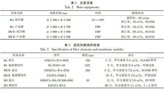 超濾膜組件和反滲透膜組件前均設(shè)置保安過濾器, 濾芯和膜組件規(guī)格參數(shù)見表 3。