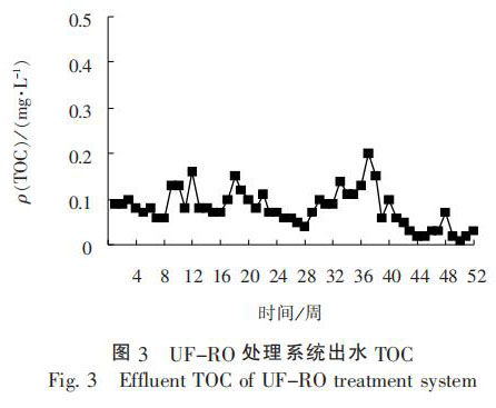 經(jīng)過 1 年的連續(xù)運行, 晶背研磨廢水進(jìn)水 TOC質(zhì)量濃度為 0.5 ~ 5.0 mg / L, 濁度為 80 ~ 100 NTU,SiO2 質(zhì) 量 濃 度 為 2 ~ 4 mg / L, 反 洗 廢 水 進(jìn) 水 TOC質(zhì) 量 濃 度 為 1.5 ~ 3.0 mg / L, 濁 度 為 4 ~ 8 NTU,UF-RO 處理出水 TOC 質(zhì)量濃度低于 1 mg / L, 濁度低于 0.1 mg / L, SiO2 質(zhì) 量 濃 度 低 于 1 mg / L, 完 全可以回用至超純水預(yù)處理系統(tǒng)。 UF-RO 處理系統(tǒng)出水電導(dǎo)率和 TOC 濃度見圖 2 ~ 圖 3。