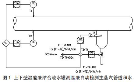 (1)主蒸汽管道積水的自動(dòng)檢測(cè)與控制。推薦采用上下壁溫差法與疏水罐測(cè)溫法結(jié)合的形式,自動(dòng)檢測(cè)主蒸汽管道的積水情況,不僅造價(jià)較低,還比單獨(dú)某種測(cè)量方法的可靠性要高很多,如圖 1 所示。