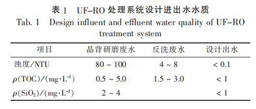 國內(nèi)某鹽酸罐液位計廠, 晶背研磨廢水產(chǎn)生量為 150 ~160 m3 / d, 反洗廢水產(chǎn)生量 為 500 ~ 700 m3 / d, 主要污染物為懸浮物, UF-RO 處理系統(tǒng)設(shè)計進(jìn)水和出水主要水質(zhì)指標(biāo)見表 1。