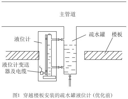 田灣核電3#、4#機(jī)組現(xiàn)場疏水罐液位測量*先采用兩個(gè)連通管把液位計(jì)測量筒與疏水罐連通,測量筒內(nèi)部含有磁浮子,磁浮子高度隨疏水罐內(nèi)液位變化,測量筒外部安裝測量桿,感受磁浮子高度,再通過下部變送器轉(zhuǎn)化成電流信號輸出到DCS系統(tǒng)。一些蒸汽管道安裝布置貼近地面,疏水罐穿越樓板,這樣就使液位計(jì)安裝后變送器位于樓板下部,即下一層廠房的房頂;如圖1所示。