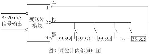 為尋求更好的改進(jìn)方案,對氨水液位計(jì)的測量原理進(jìn)行了深入研究。液位計(jì)測量桿中是由等間距排布的干簧管和電阻元件組成,當(dāng)磁浮子達(dá)到某一高度時(shí),對應(yīng)的干簧管閉合,如果能識別出哪個(gè)干簧管閉合,即可獲得當(dāng)前液位值。那么變送器又是如何識別出哪個(gè)干簧管閉合的呢?再次探究測量桿內(nèi)部電路,繪制液位計(jì)內(nèi)部原理圖,如圖3所示。測量桿內(nèi)部電阻串聯(lián)連接,每兩個(gè)電阻的連接處連接干簧管的一端,干簧管的另一端并聯(lián)連接,*終引出蘭、棕、黑三根信號線。