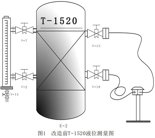 原T-1520液位測量為下圖1所示,左側為液化石油氣液位計,右側為雙法蘭磁性浮子液位計。
