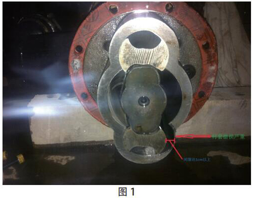 2015 年 8 月 10 日 17:50 機(jī)組在運(yùn)行過程中“機(jī)組高位油箱事故低油位動(dòng)作”事故停機(jī)?,F(xiàn)場檢查發(fā)現(xiàn)機(jī)組高位油箱油位為 60mm,低于下限值 90mm。進(jìn)一步檢查發(fā)現(xiàn),稀油站 2# 低壓油泵空轉(zhuǎn),沒有打油,振動(dòng)、聲音較大。18:18 維護(hù)人員對 2# 低壓油泵進(jìn)行了搶修拆解。發(fā)現(xiàn)油泵從動(dòng)螺桿與襯套間隙過大,達(dá) 1cm 以上,襯套磨損嚴(yán)重(見圖 1)。油泵損壞,無法打油。