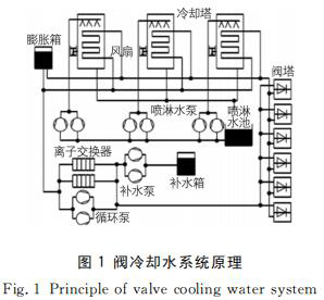 閥冷卻水系統主要構成部分為閥內冷水系統與閥外冷水系統。閥內冷水系統主要通過內冷水與閥組件直接接觸流動,將氯乙烯液位計中熱量帶出,確保氯乙烯液位計組件中晶閘管、水冷電阻、陽*電抗器等發熱元件運行溫度具有可控性。而閥外冷水系統主要通過閉式冷卻塔或風機將內冷水中熱量帶走,并排放至環境中。氯乙烯液位計內、外冷水系統的協同運行,可以使氯乙烯液位計組件內部冷卻持續進行,并滿足元器件結溫要求,進而保證系統整體運行穩定性、安全性。閥冷卻水系統原理如圖1所示。
