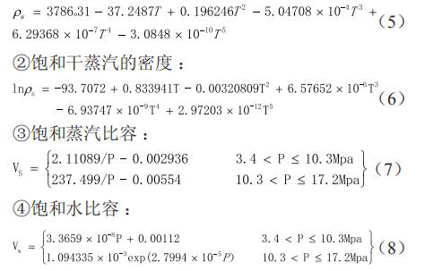 其中,ρs 為蒸汽密度(kg/m3),ρw 飽和水密度 (kg/m3),ρsw 為濕飽和蒸汽密度 (kg/m3),vs 為飽和蒸汽比容(m3/kg),vw 為飽和水比容 (m3/kg),vsw 為濕飽和蒸汽比容,X 為干度。