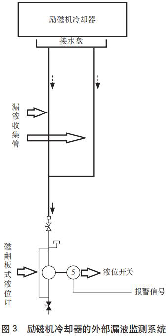 實際運行經驗表明,側裝式磁翻板液位計內部銅管發生泄漏的概率較低,但一旦發生泄漏,漏液會隨著冷卻空氣沿閉合風路進入勵磁機內部,造成勵磁機短路損壞的嚴重后果。為了保證機組安全,應有冷卻器內部銅管泄漏監測裝置,然而現場沒有配置此類裝置。