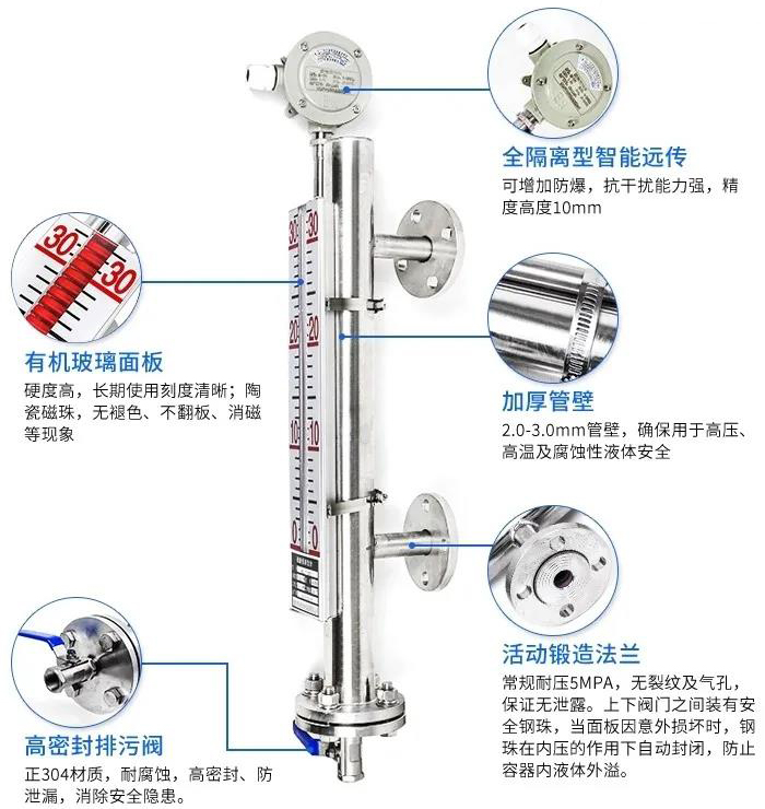 磁翻柱液位計是根據連通器和帶磁藕合基本原理而工作中的。做為一種普遍的液位儀檢測儀表,被普遍用于石油化工設備、倉儲物流運送等制造行業對各種各樣儲槽、儲罐、球形器皿和加熱爐等機器設備內的物質開展液位儀檢驗。相關磁翻柱液位計的基本原理,大家都廣為人知,但對其構造和特性卻了解很少。那麼,磁翻柱液位計的構造構成和特性有什么呢?