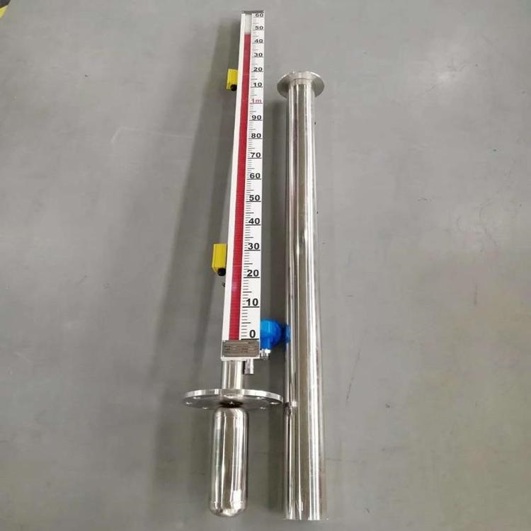 原理:根據浮力原理和磁性耦合原理而制成的,當被測容器內的液位上下變化時帶動浮球,并通過與之相連的連桿上端的永久磁鋼上下移動,經磁性藕合而使顯示器中的翻柱翻轉。當液位上升,翻柱由白色轉為紅色,當液位下降時翻柱由紅色轉為白色,紅白界位處就為容器內介質液位的實際高度,從而實現(xiàn)液位自動跟蹤顯示。