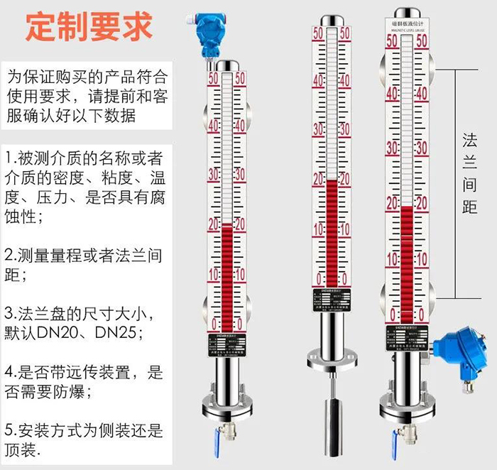 聯(lián)接法蘭盤,作為浮桶與被測(cè)器皿中間的聯(lián)接小管上的標(biāo)準(zhǔn)件,依據(jù)工作狀況的不一樣,必須挑選不一樣工作壓力和直徑,全過程聯(lián)接法蘭盤兩者之間相一致。一般將2個(gè)聯(lián)接法蘭盤中間的間距做為磁性液位計(jì)的測(cè)量范圍。以及防腐蝕型磁性液位計(jì)的全過程聯(lián)接法蘭盤還必須有里襯,以防止物質(zhì)出現(xiàn)意外泄露。