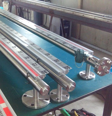液位計根據浮力原理,浮子在測量管內隨液位的升降而上下移動,浮子內的永久磁鋼通過磁耦合作用,驅動紅、白色翻柱翻轉180’液位上升時,翻柱由白色轉為紅色,下降時,翻柱由紅色轉為白色,從而實現液位的指示。