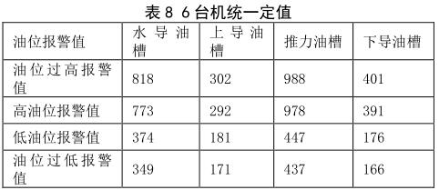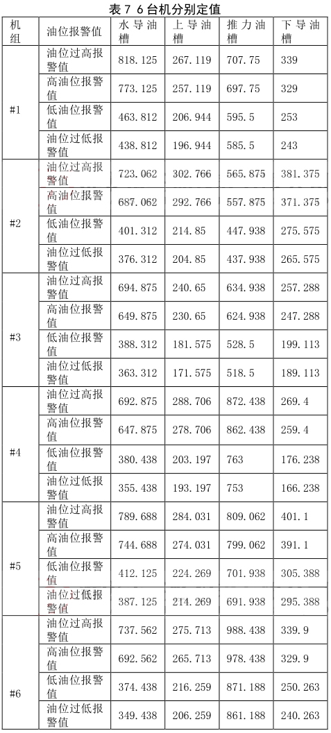 (2)依據成都勘測設計院給的定值要求,建議每臺機設置不同的報警值。設置原則:在上導、下導、推力各部油槽油位,結合機組運行時的油位*大值上設置高油位報警值+20mm、過高油位報警值 +30mm;*低油位值上低油位報警值 -20mm、低油位停機值 -30mm;水導油槽油位:高油位報警值 +45mm、過高油位報警值 +90mm;*低油位值上低油位報警值 -130mm、低油位停機值 -155mm;躲過報警值。在此基礎上,真實的油位只會下降,設置值對油位的運行是安全的。分析確定的#1-#6 機組各油槽油位的動態油位報警值,即機組運行時油槽油位的過低、低、高、過高報警定值如下,可以選擇表 9 的數據 6 臺機分別進行定值,同時也提供定值表 10 進行 6 臺機統一進行定值。
