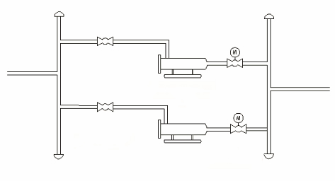 在輸氣站場(chǎng)根據(jù)下游用戶(hù)年設(shè)計(jì)輸氣量及檢維修需求通常設(shè)置兩臺(tái)臥式過(guò)濾分離器,運(yùn)行時(shí)通常采用一用一備方式運(yùn)行,氣量需求高峰時(shí)段達(dá)到單臺(tái)處理量時(shí)兩臺(tái)同時(shí)運(yùn)行以滿(mǎn)足用戶(hù)氣量需求。過(guò)濾分離器在整個(gè)輸氣站場(chǎng)工藝流程中通過(guò)法蘭與管道相連,同時(shí)上下游均設(shè)置球閥(見(jiàn)圖1),其中下游球閥與電動(dòng)執(zhí)行機(jī)構(gòu)相匹配使用,能實(shí)現(xiàn)遠(yuǎn)程開(kāi)關(guān)控制。在正常運(yùn)行狀態(tài)下,在用過(guò)濾分離支路的上下游球閥處于完全開(kāi)啟狀態(tài),備用過(guò)濾分離支路的上游球閥處于開(kāi)啟狀態(tài),下游球閥處于關(guān)閉狀態(tài)。對(duì)于過(guò)濾分離器切換有兩種方式:一種是手動(dòng)模式,另一種是自動(dòng)模式。在手動(dòng)模式下可由操作人員通過(guò)遠(yuǎn)程和就地狀態(tài)下實(shí)現(xiàn)過(guò)濾支路流程切換;當(dāng)在自動(dòng)模式下電動(dòng)閥產(chǎn)生事故關(guān)斷時(shí),則報(bào)警并自動(dòng)選擇備用設(shè)備,打開(kāi)備用支路的電動(dòng)閥,關(guān)閉當(dāng)前支路的電動(dòng)閥門(mén),實(shí)現(xiàn)工作分離器和備用分離器的切換,上述過(guò)程由程序自動(dòng)完成,不需人為干預(yù)。