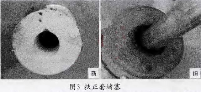 扶正套的材料為塑料,在連桿的上下反復(fù)運(yùn)動(dòng)過(guò)程中,易將砂粒及稠油帶至扶正套處,造成孔眼堵塞(圖3),進(jìn)而阻礙了連桿的上下活動(dòng),導(dǎo)致液位計(jì)無(wú)法根據(jù)現(xiàn)場(chǎng)實(shí)際液位變化瞬時(shí)復(fù)原,形成假液位,測(cè)量不準(zhǔn)確。